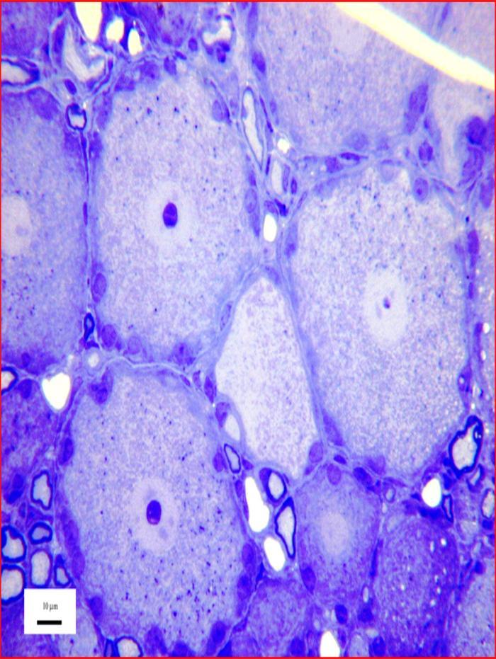 Sensory nerve cells such as these are located in a swelling, or ganglion, on the dorsal root of a nerve connected to the spinal cord. Each gives rise to a single nerve fibre, or axon, that branches once within the ganglion. One branch enters the spinal cord to make connexions with other nerve cells, while the other passes through peripheral nerves to form a sensory ending in skin, muscle, joints, viscera, etc. The endings are usually specialised to respond variously to touch, pressure, movement, heat, etc. The tissue has been chemically fixed, dehydrated, and embedded in epoxy resin. The section was cut with a glass knife and is 1 micrometre thick. It was stained with toluidine blue for light microscopy.